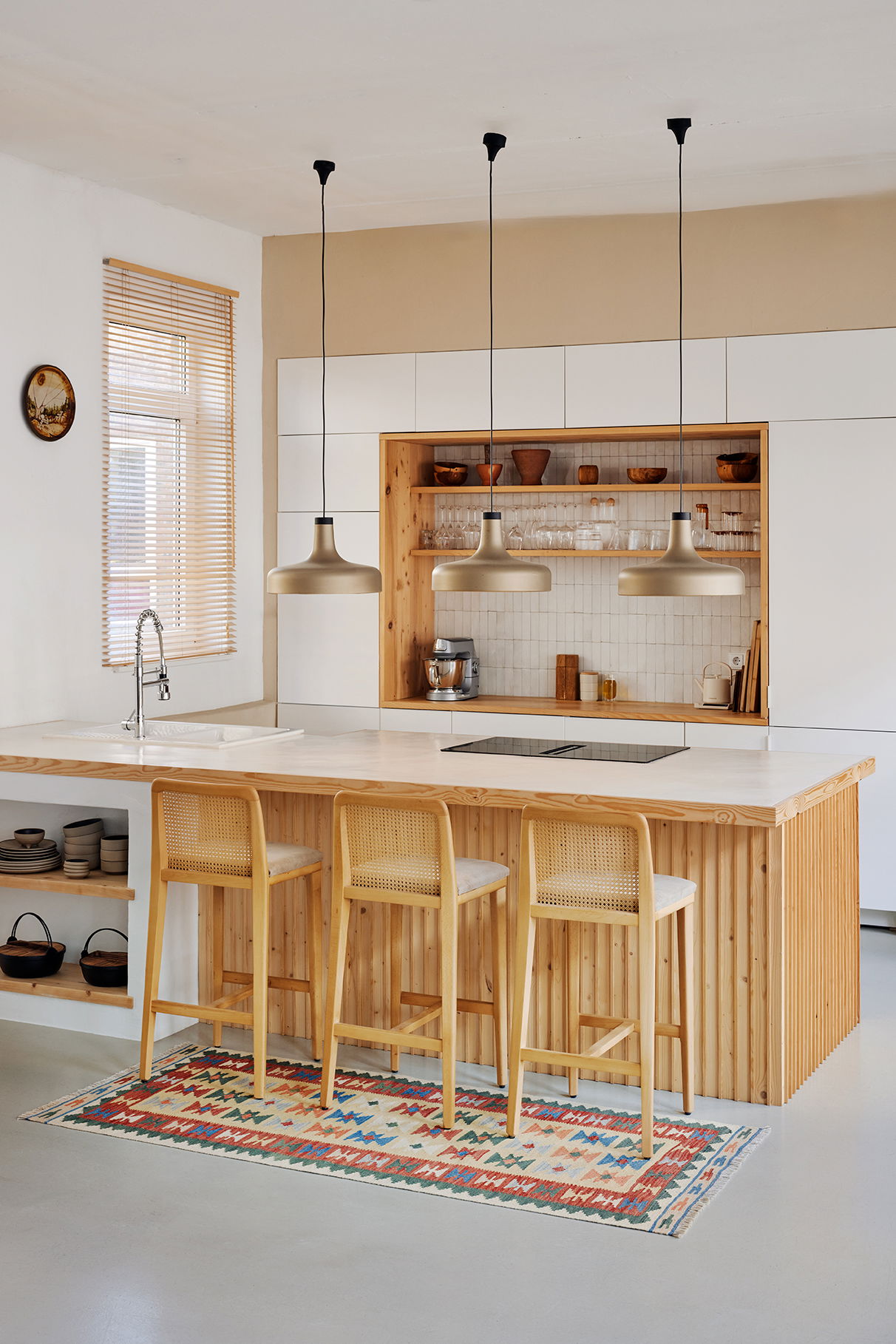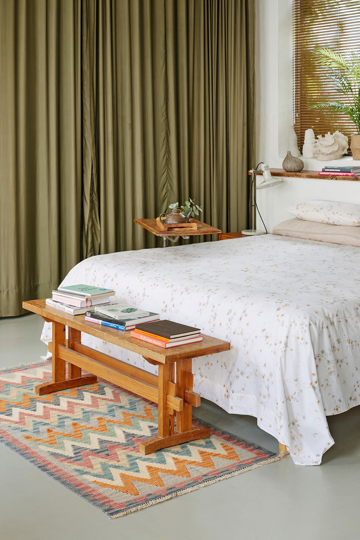 Ein marokkanischer Beni Ourain unter einem anatolischen Kelim? Klingt mutig, funktioniert aber hervorragend.
