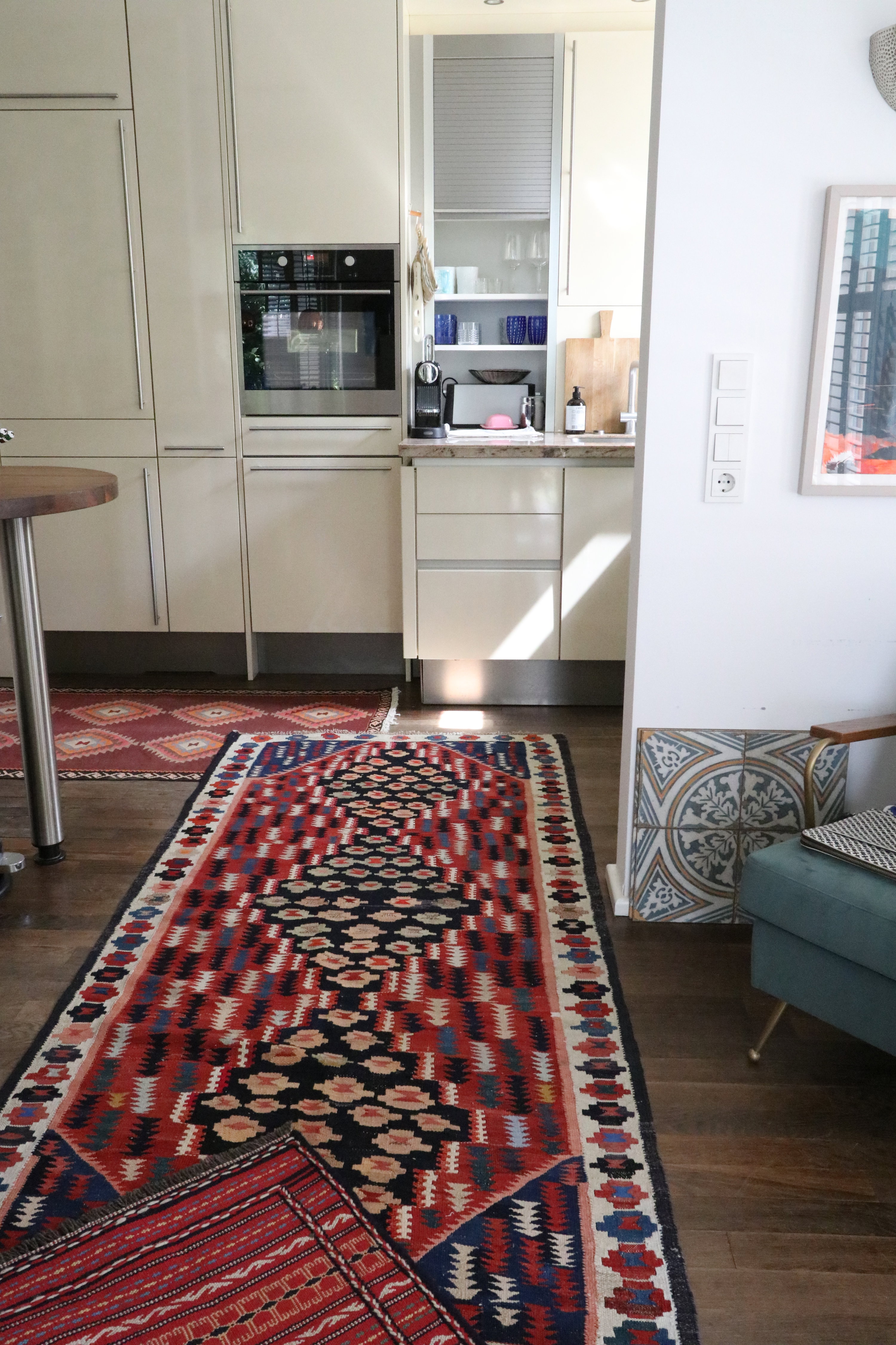 Im Gegensatz zum strengen, aufgeräumten Minimalismus erlaubt der eklektische Stil Brüche, Überraschungen und visuelle Spannung. Die Wohnung wird zur Bühne für Individualität – und Teppiche spielen dabei eine Hauptrolle.