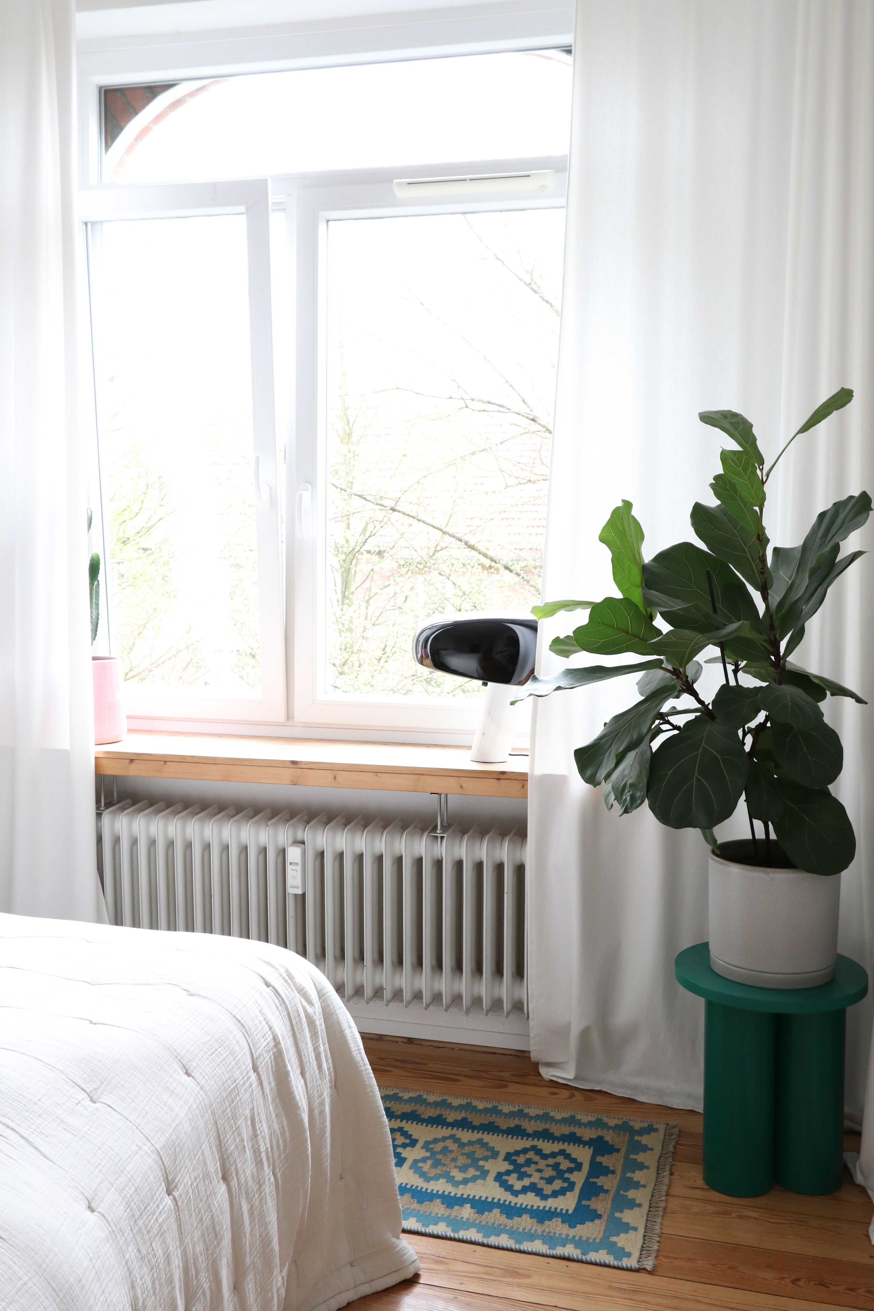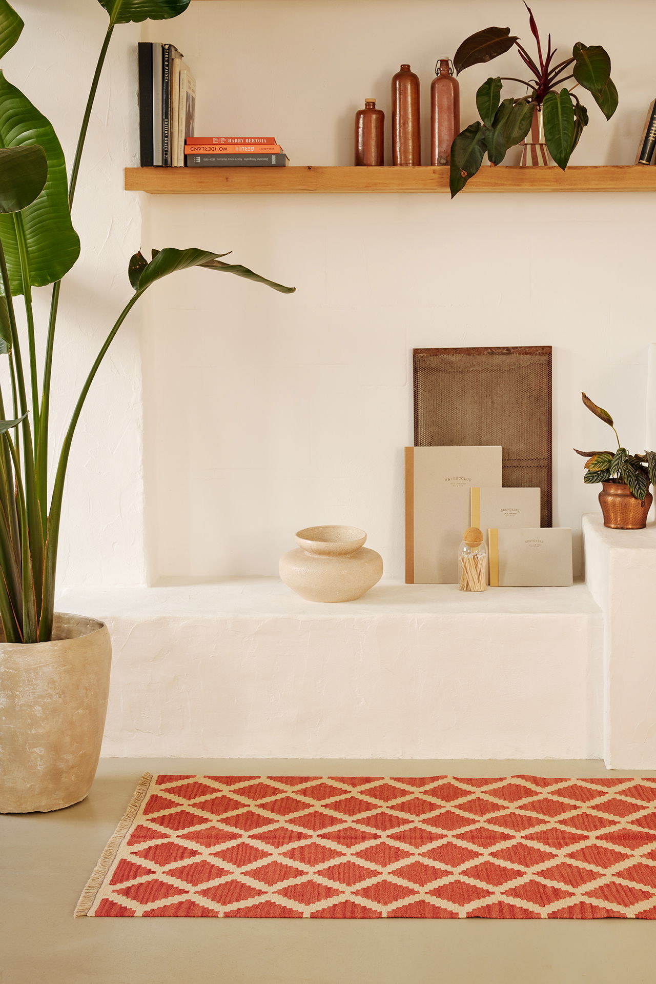 Pflanzen bringen Frische und Bewegung, ein Wollteppich liefert Wärme, Struktur und visuelle Erdung. Zusammen entsteht eine Atmosphäre, die klar, ruhig und einladend wirkt.